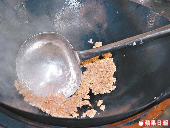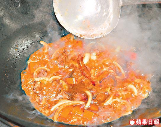 2.花椒、辣椒亁、蝦醬、蜆蚧、蝦米茸等調味香料同下油鑊爆香;蟹件回鑊加葱炒至全熟。