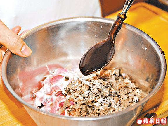 2.豬肉洗淨後用油、生粉、生抽先醃,然後剁碎。
