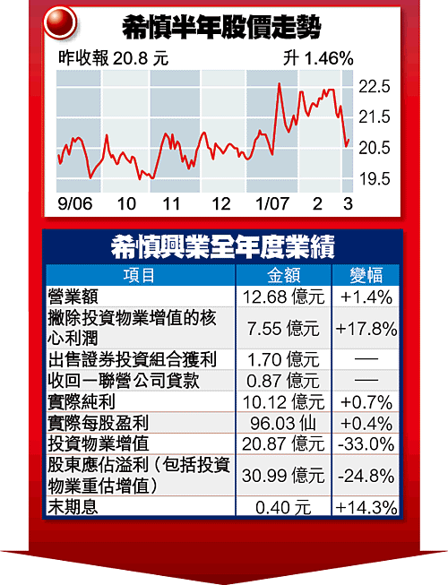 銅鑼灣商場及寫字樓大業主希慎興業(014)去年核心的收租業務利潤增加17.8%,加上出售證券投資組合獲利1.7億元,令實際純利微升0.7%,至10.12億元;但由於投資物業重估增值減少逾三成,截至去年12月底全年純利31億元,倒退24.8%。末期息增加14.3%,派40仙。
