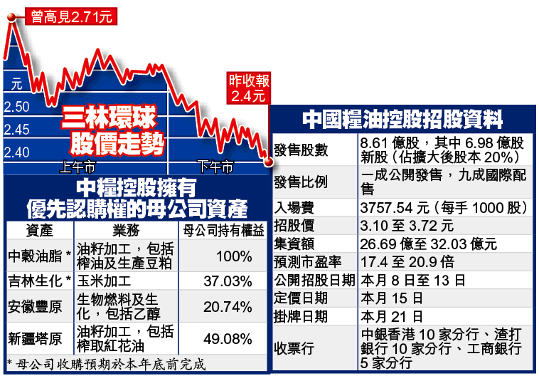 中糧國際(506)分拆的乙醇生產商中糧控股(606)今日至下周二公開招股,招股價3.1至3.72元,最多集資32.03億元,入場費3757.54元。主席寧高寧表示,希望母公司中糧集團未來數年逐步注資至中糧控股,包括油籽和玉米加工等業務,以及安徽豐原的乙醇生化業務。