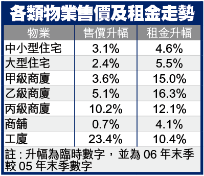 第一太平戴維斯估值及專業顧問董事總經理陳超國認為,因為本港樓價自03年「沙士」後,曾大幅飆升,但租金卻不能及時作相應調整。然而,過去兩年因樓價升幅過大,減低市民入市意欲,個別更轉為租樓,加上業主在租約期滿調升租金的情況下,令租金升幅跑贏樓價升幅。但相信今年樓價在中小型單位需求帶動下,樓價升10至20%,租金升幅則會略為放緩。