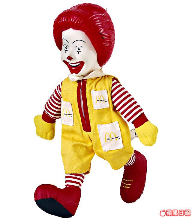 a.1963年第一部由麥當勞叔叔上演的電視廣告,由當時的電視節目紅小丑威樂史葛(WillardScott)扮演,頭上頂着大餐盤,腰上一個亦放滿漢堡包、薯條和大汽水,他後被麥記封為原創。