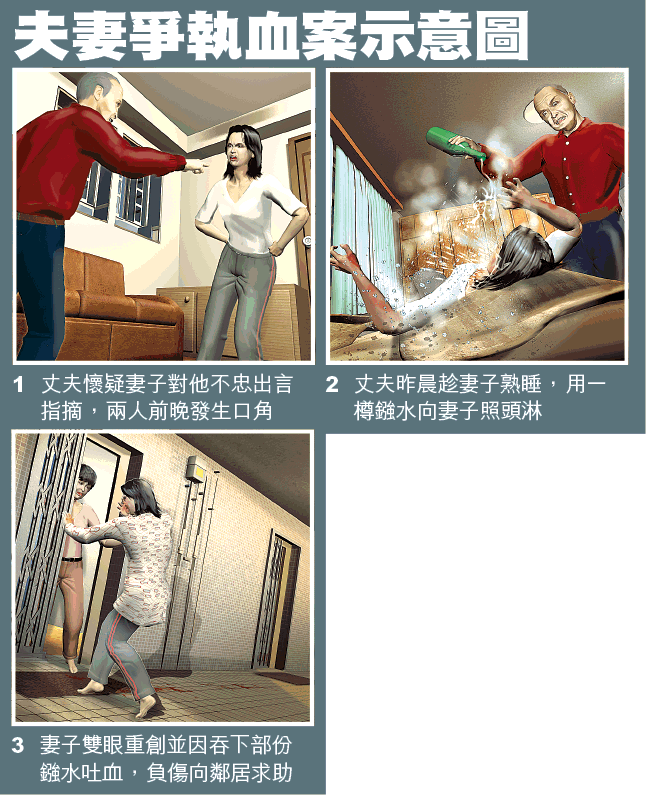 【本報訊】粉嶺華明邨昨發生老夫少妻家庭暴力慘劇,一名64歲無業男子懷疑比他年輕26載的妻子對他不忠,竟乘妻子熟睡期間,用鏹水向她照頭淋。女事主驚醒呼叫,更吞下部份鏹水,當場口吐鮮血負傷奪門向鄰居求救。警方接報到場拘捕疑行兇的丈夫,傷者送院急救,由於腐液傷及內臟,目前情況危殆,她臉部更因被鏹水腐蝕,恐會被毀容且有失明之虞。至昨晚深夜,警方將案件列作企圖謀殺處理。 記者:徐雲庭、譚健文