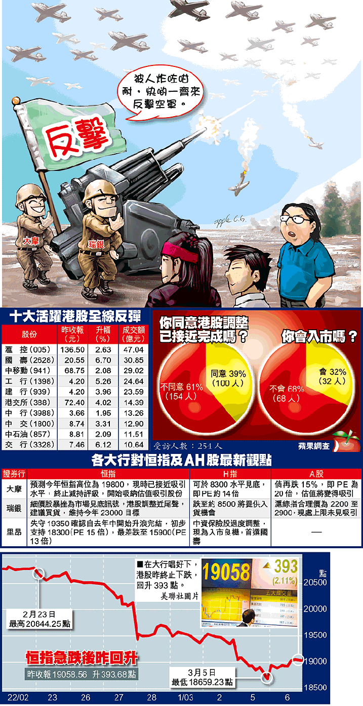 日圓升勢收斂,亞太股市在股災翌日普遍上揚,加上滙豐控股(005)去年業績對辦,以及大行估計調整已近尾聲,港股由高位累積下跌2156點以來,昨出現似樣反彈。恒生指數高開235點後,午後升幅擴大,重越萬九關,收報19058.56,飆393.68(2.11%),即月期指低水55點,主板成交610.32億元。