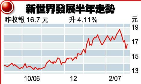 里昂於1月因憧憬新世界分拆業務,將其投資評級由「跑輸大市」調高至「買入」,目標價上調至19.3元。該行指出,以百盛(3368)與金鷹商貿(3308)等公司現估值衡量,分拆NWDS價值可達40億元,為新世界增值19億元。