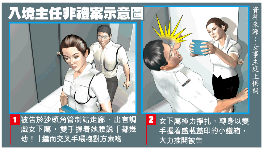 被告繼而將她推近一個轉彎凹位,以交叉手環抱其腰,並說:「好想錫你,快啲畀我錫!」女下屬轉身以盛載蓋印的小鐵箱大力推開被告,其後向男同事投訴,事件驚動上級報警。