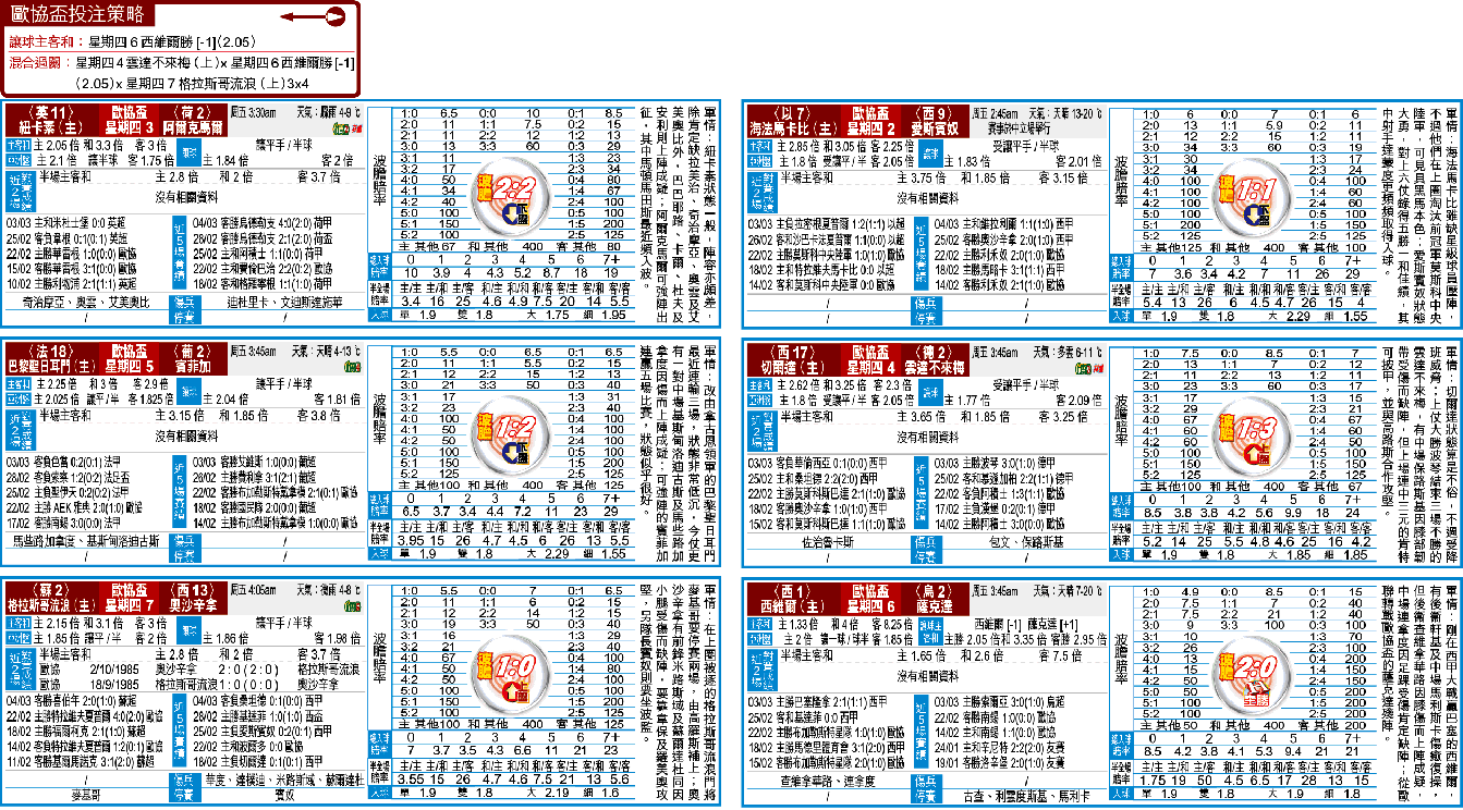 賽前與不來梅同以4.5倍並列冠軍大熱的西維爾,是役雖有中場連拿度因足踝受傷而肯定缺陣,後衞查維拿華路則因膝傷而上陣成疑,但有後衞軒基及中場馬利斯卡傷癒復操,故兵源尚算充裕;再者,他們上周六在西甲大戰贏巴塞隆拿上榜首後,士氣大振,故今迎有3主力古查、利雲度斯基及馬利卡停賽的烏克蘭球隊薩克達,1.33倍W冇走雞;而「讓球主客和」西維爾讓一球,夠信心更可吼「主勝」。