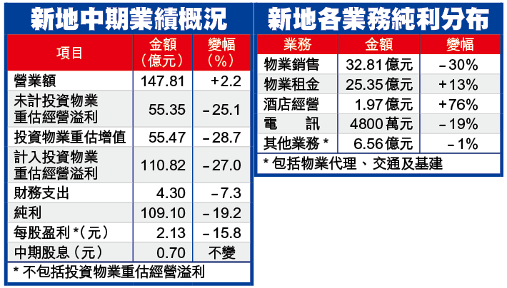 【本報訊】新鴻基地產(016)公布截至去年12月底止中期業績,由於售樓收益減少,純利109.1億元,減少19.2%,不計投資物業重估升值的非現金收益,半年純利52.97億元,較上年度下跌13%,接近市場預期下限。每股盈利2.13元,中期息維持0.7元。大股東郭氏三兄弟可收息7.6億元。