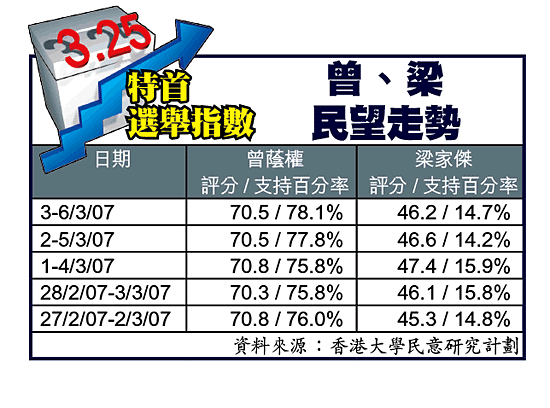 兩大陣營民望變化方面,據本報委託港大民意研究計劃進行的滾動式調查,袋巾最新評分為46.2,較前再回落,煲呔評分則維持不變。