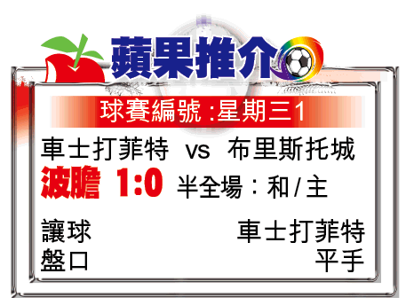 儘管排名相差17位,但在英格蘭低組別聯賽已多次出現「細蝦大」的歷史印證下,英甲的車士打菲特,周一在主場迎擊多次失分給中、下游球隊的布里斯托城,平手盤敲主隊有利無害!(球賽編號:星期三1;香港時間明日3:30am開賽)