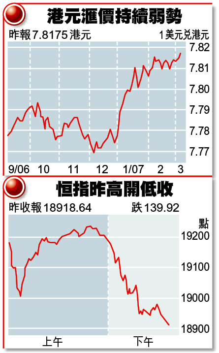 股市跌、港元弱、拆息升,三者齊齊構成一個造淡好藉口,即是資金外流。而港元兌美元近期拾級而下,逼近7.82,拆息更由年初3.9厘持續回升至現時約4.2厘,資金流走可謂言之鑿鑿。恒生銀行(011)副董事長柯清輝昨亦出口術,指短期拆息升至4厘,見到有資金流走的情況出現;這暗示港股一直依賴資金推動的大牛市,升市動力可能失去。