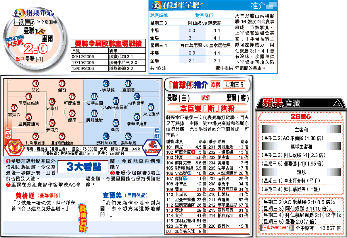 曼聯歐洲賽主場出擊一向有信心保證,今屆3場分組賽全勝(見附表),並有兩次淨勝對手兩球以上,增添捧曼聯「讓球主客和」「主勝」信心。形勢上,里爾今仗「焗攻」,要追首回合失地,更不利這支擅打突擊的法國兵,後防更易露出缺口,讓基斯坦奴朗拿度、朗尼等快馬為所欲為。