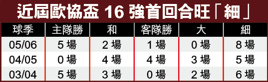 朗斯與利華古遜的實力雖屬「五五波」,但翻看近3屆歐協盃16強首回合往績,佔主場之利的球隊勝率相對較高,而「入球大細」則較旺吹「細」風。