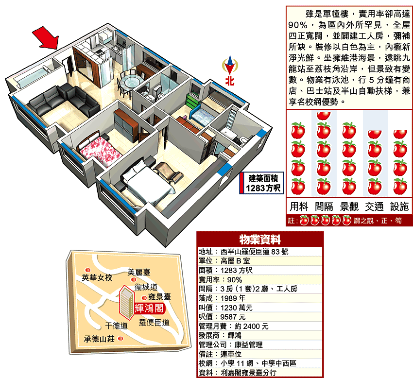 近期樓市向好,業主態度樂觀,輝鴻閣已無平盤,海景呎價8500至10000元,樓景8000元,放盤共15個。另外,租盤少於5個,呎租介乎23至25元。