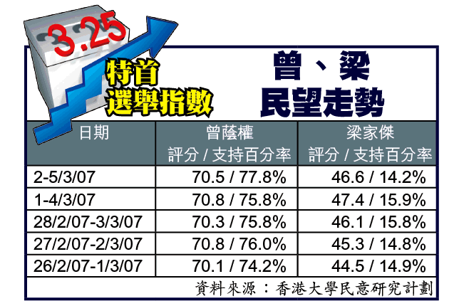 至於兩大陣營民望變化,因3.1答問大會熱潮漸退,連帶袋巾梁的風頭也略略減褪。據本報委託港大民意研究計劃進行的滾動式調查顯示,袋巾在本月2至5日間的評分為46.6,較1至4日的47.4分稍稍回落;評分下跌情況同樣應用在煲呔身上;兩人要重振雄風,看來要靠3.15論壇了。