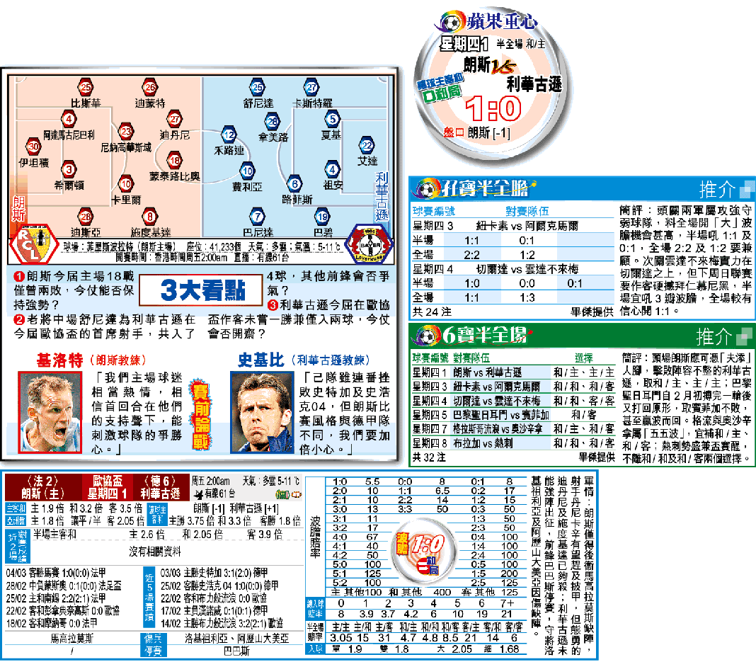 此外,利華古遜近期表現回勇,與祖安的復出及巴巴斯演出優異有直接關係;尤其後者不時回後參與防守,進攻時亦多番駁腳組織攻門,其位置舉足輕重。如今巴巴斯停賽,頂替的傑斯寧或費利亞亦非屬此類球員,攻守能力難免有所削弱。因此,朗斯單W屬正路之選,波膽則吼「和局」1:0。