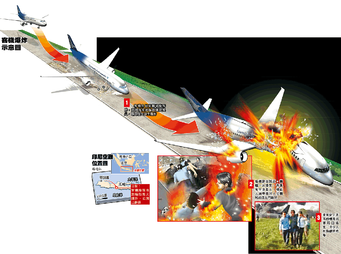 消防員用兩小時撲熄大火,機身已燒成廢鐵,僅機頭和機尾可以辨認。廢鐵前面,又是救援人員用黃色袋包裹的一具具屍體,嘉魯達航空證實,共有23人罹難,包括1名機組人員。印尼去年每隔9至10天就會發生或大或小的航空事故,今次燒成廢鐵的客機和那些黃色裝屍袋,又給印尼航空安全問題一次強力控訴。