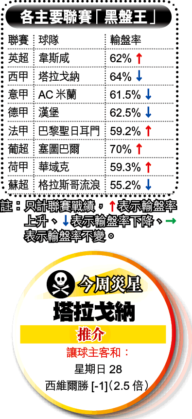 今周推介大家專攻西甲黑盤王塔拉戈納對家;塔軍上仗作客畢爾包,受讓半/一都可以贏2:0,唔多唔少有幸運成份,不過塔軍贏波都要付出代價,後防主力明高攞紅牌,今仗要停賽。盤路計,塔拉戈納今季從未連續贏盤多於兩次,以塔軍先迫和華倫,再贏畢爾包,連贏兩次盤,今仗主場對西維爾喺時候輸番凸。