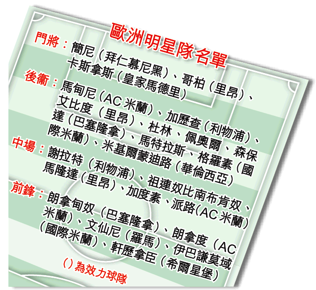 為意大利贏得應屆世界盃的納比,將為歐洲聯賽明星隊出任領隊,除了早前答應「入伍」的朗拿甸奴、謝拉特等名將外,周一再獲多名球星加盟,包括AC米蘭4星馬甸尼、加度素、派路和朗拿度,皇馬門將卡斯拿斯、羅馬前鋒文仙尼和華倫西亞後衞米基爾蒙廸路;而賽事另一焦點,是碧咸重返奧脫福。雖然萬人迷因傷避戰,但仍會出席這個盛會。