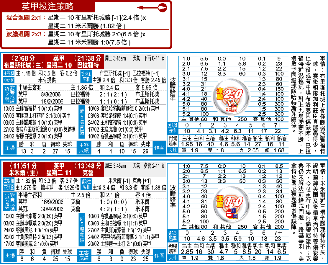 周二英甲只上演兩場賽事,但兩支主隊贏面甚高,唔貪心串埋都博到餐晏仔食。當中米禾爾主場迎戰大鬧前鋒荒的克魯,1.82倍主W為全日重心,再拖積弱的巴拉福特到訪布里斯托城淨輸兩球,開「讓球主客和」布軍[-1]的「主勝」。