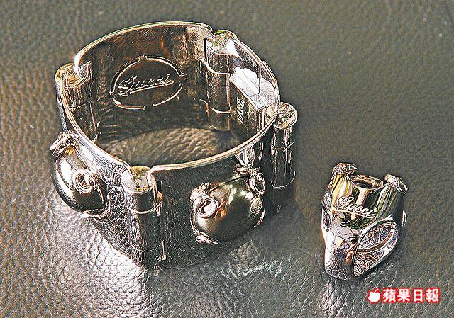 配飾系列在07年一片銀光閃閃,高跟鞋、平底涼鞋等,以銀色真皮質料鑲上圓邊三角形的鏡面或銀片等飾面,性感剛強,銀色與Horsebit在今季更成為夢幻絕配。 Horsebit這個在Gucci歷史長河中,從來都是地位超然的signatureelements,今季化身成各式銀色圓釦,搶眼地扣在widebelt、漆皮皮帶上,全新登場的Horsebit白金戒指及白金手鐲,更令人充滿擁有的慾念。