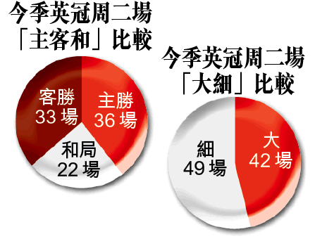 英冠例牌會在周二上演一輪聯賽秩序,今期資料寶藏便找出今季於「周二」比賽的數據予球迷參考。當中發覺和波次數較少,而開「細」比率稍稍高於入球「大」。