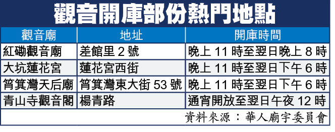 每年開庫都吸引大批善信排隊輪候的紅磡觀音廟和大坑蓮花宮等地,今日都會由晚上11時起通宵開放,讓善信借庫,直至明日下午為止。