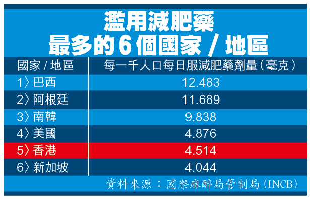 在亞洲地區中,以南韓濫用減肥藥最嚴重,每一千名南韓人口中,每日服用9.838毫克減肥藥。至於排行第五的香港,每一千名香港人口中,每日服用4.514毫克減肥藥(見表)。
