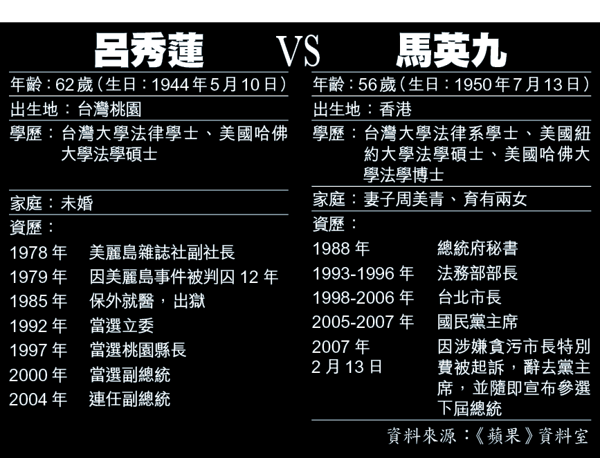 台灣2008年總統大選,正讓藍、綠兩大陣營的候選人陷入爾虞我詐、你死我活的處境。執政民進黨中最早登記黨內初選的副總統呂秀蓮在接受本報專訪時,呼籲黨內要團結一致,共同對外,並高呼「我們(民進黨)的對手可能是馬英九博士,他的外表、口才、學識和外語能力,我想我應該是(他)最好的對手」,並直言多年致力台灣民主運動、擁有7年治理國家等經驗的她,是所有藍綠候選人所缺乏的人才。「過去,十一屆總統都是男性天下,enoughisenough」,她呼籲民眾給女性一個機會。