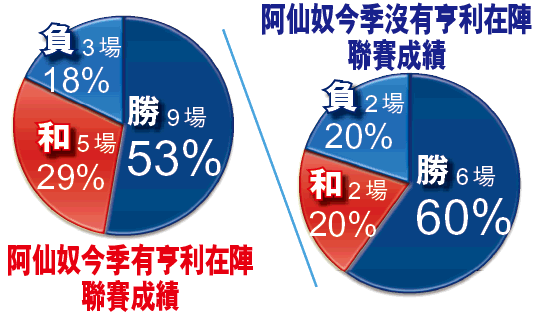 阿仙奴截至周二,共進行了27場聯賽;翻查亨利缺陣的10場比賽中,阿仙奴共取得6勝2和2負,勝率達6成,當中更有包括作客以1:0擊敗曼聯、1:1迫和車路士等代表作;相反亨利有份上陣的17場比賽,阿仙奴取得9勝5和3負的成績,勝率只得53%,足足下降7%。
