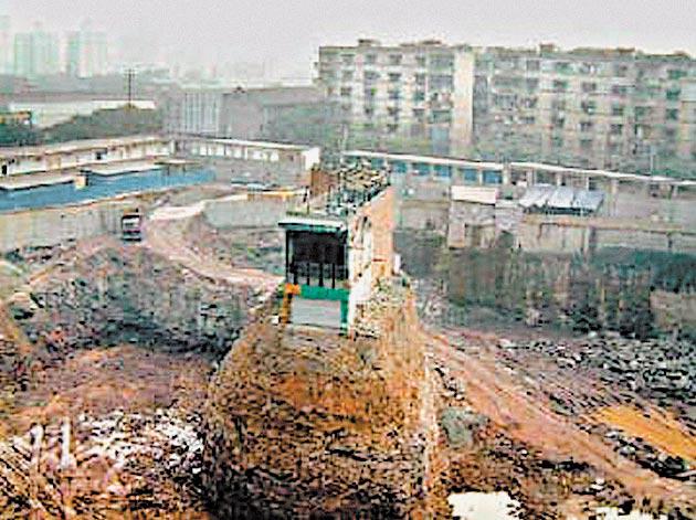 內地形容不滿賠償而堅拒搬遷的住戶為釘子戶。有網民最近拍到重慶市九龍坡區楊家坪步行街附近,一幢兩層高舊樓孤零零處在一個擬興建豪宅的地盤內,其周圍都被挖成10米大坑,恍如大海中一葉孤舟(圖)。網民將之冠名「史上最牛釘子戶」,不但在各大網絡論壇引起廣泛爭議,更有內地傳媒跟進調查。據悉,那棟小樓的業主向開發商要求2,000萬賠償不果而堅拒拆遷,且因業主有背景,令開發商不敢動它,於是形成現在的奇觀。