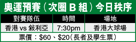 【本報訊】受傷兵及停賽影響,香港奧運足球隊今晚在大球場上演的奧運預賽(次圈B組),將變陣迎戰敍利亞。教練黎新祥指出,若球隊發揮水準,今仗可坐和望贏。