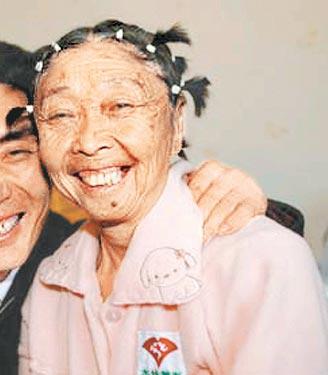 遼寧凌海一對老妻少夫,69歲的馬玉琴和37歲的李玉成,結婚10年仍恩愛,老妻為了看來年輕點,拉近與丈夫的年齡差距,前日去瀋陽一家美容院做除皺手術。手術床上的馬玉琴,原本皺巴巴的皮膚變得光滑(圖)。醫生說,手術成功,切去了老婦2.8厘米頭皮,臉部消腫後將年輕30歲。 新華網