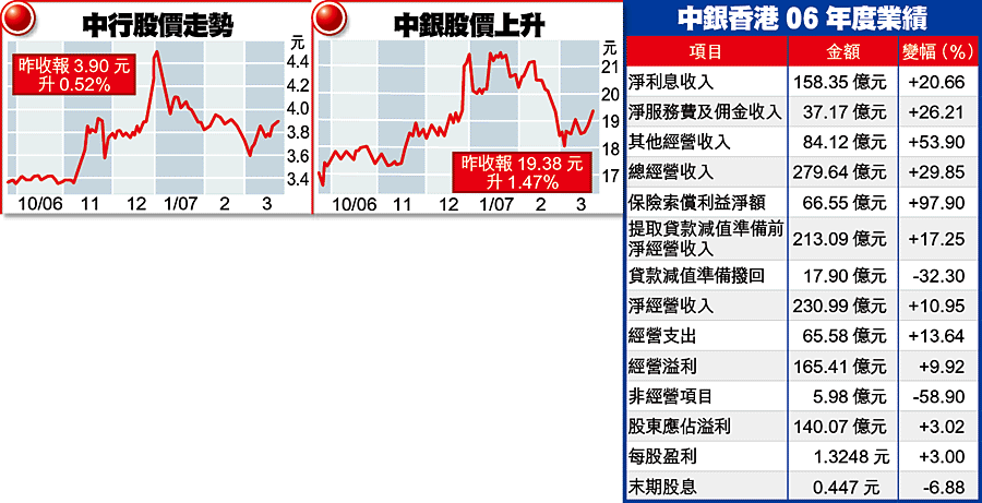 中銀香港末期息每股派0.447元,較05年減少6.875%;不過,連同中期息每股0.401元在內,全年股息合共0.848元,升幅4.95%,派息比率由05年的62.83%升至06年64.01%。