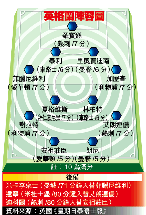 當然,英格蘭領隊麥卡倫太過平庸亦是原因之一。麥卡倫將夏格維斯放在謝拉特及林柏特中間,想區分後兩者在場上的功用,惟效果欠佳。左路的艾朗連儂速度雖高,但過關斬將能力卻不及受傷的祖高爾。此外,前線的安祖莊臣及朗尼各自為政,後者更受制於敵方嚴密看管、以及缺乏隊友具效率與組織的傳送,難怪兩名前鋒賽後均只獲評5分。文:畢傑