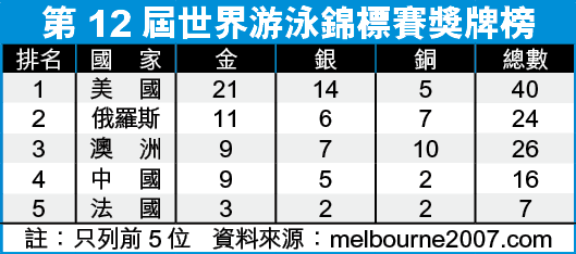 誰是今屆墨爾本世界游泳錦標賽的大贏家?不用多說,美國在費斯及雷恩等人的帶領下,囊括21面金牌在內的40面總獎牌數目,以更勝兩年前加拿大蒙特利爾世錦賽所得的17金,再次稱霸泳壇!不過國家跳水隊未有讓美國專美,在10個跳水項目中,國家隊以9金的佳績,延續「跳水王國」的美譽。
