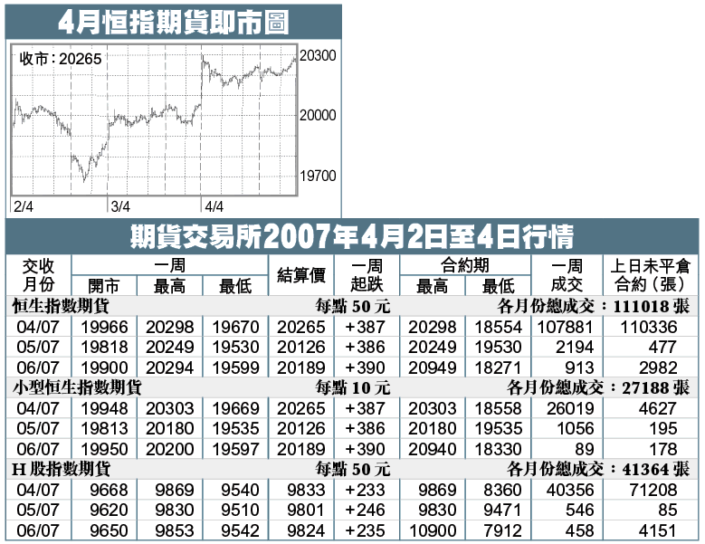 外圍股市持續造好,加上中東局勢緩和,利淡因素已被淡化,上市公司業績期過後,應可吸引中長線投資者入市。期指自3月5日大跌後見底,目前已彈升約1700點,經過雙底轉向形態後,強勢持續,已升破多個阻力位,而且較早前已完成技術後抽,力守頸線支持,令升浪更為健康。中期升軌已形成,支持位在19860至19900。