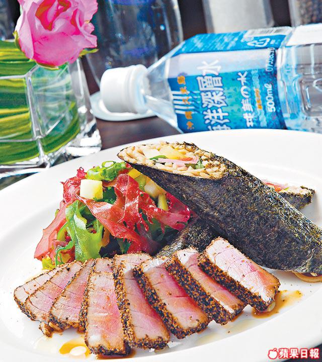選用由日本海床深處開採的Okinawa水,配合肉身結實的夏威夷吞拿魚腩,魚肉味稍腥,而礦泉水氣帶點鹹,兩者的鹹味配合得宜,還可稍減腥味。旁邊卷物以日式雜菜及冷麵做成的壽司卷,是一道非常有日本特色的菜式。