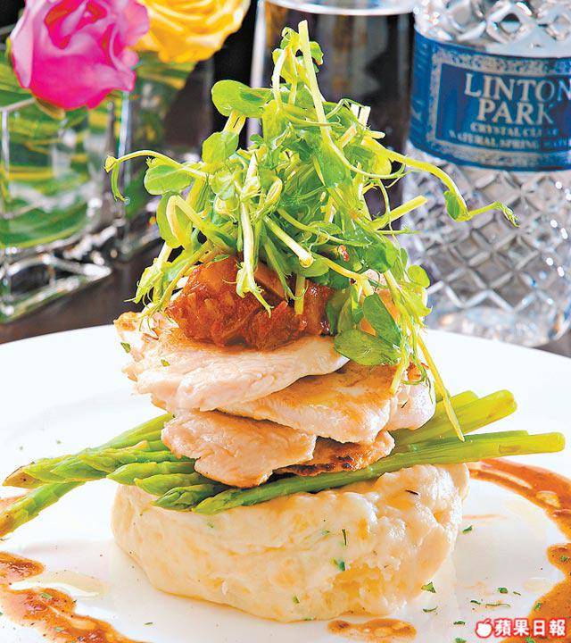 豆苗下先以意大利雜菜加番茄做成的茄茸醒胃,師傅再按時選用丹麥、法國或巴西嫩雞肉,薄身切以防雞肉嚡口,底層有新鮮即打的薯茸,具有濃蒜香味。整個菜式以「滑」做主題,最好配合澳洲的LintonPark泉水,入口幼滑味道清新,冇氣感覺較Smooth,唔會與雞味互撞。