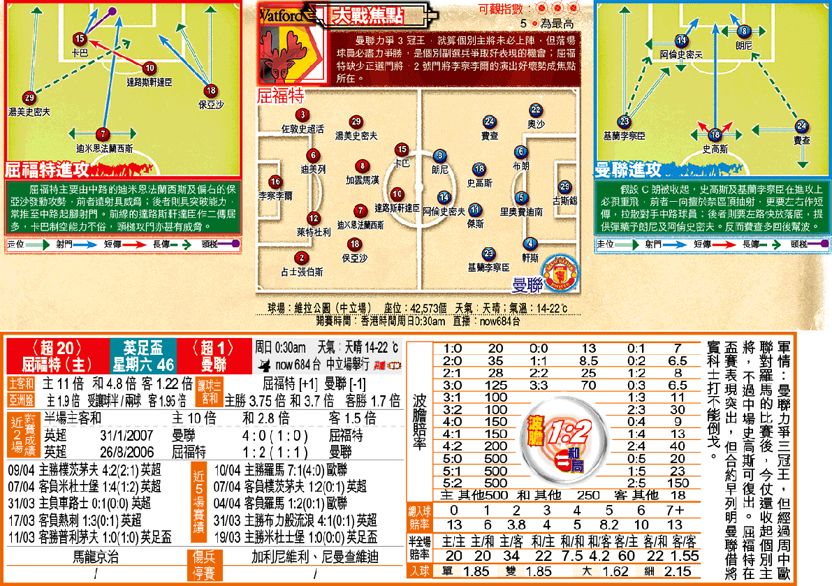 維拉公園是曼聯的福地,近年在此進行英足盃準決賽未輸過,取得5勝2和,而5場勝利中,其中4場贏對手1球。綜合上述戰力及數據分析,今仗「讓球主客和」的「和」有3.7倍確值一吼。