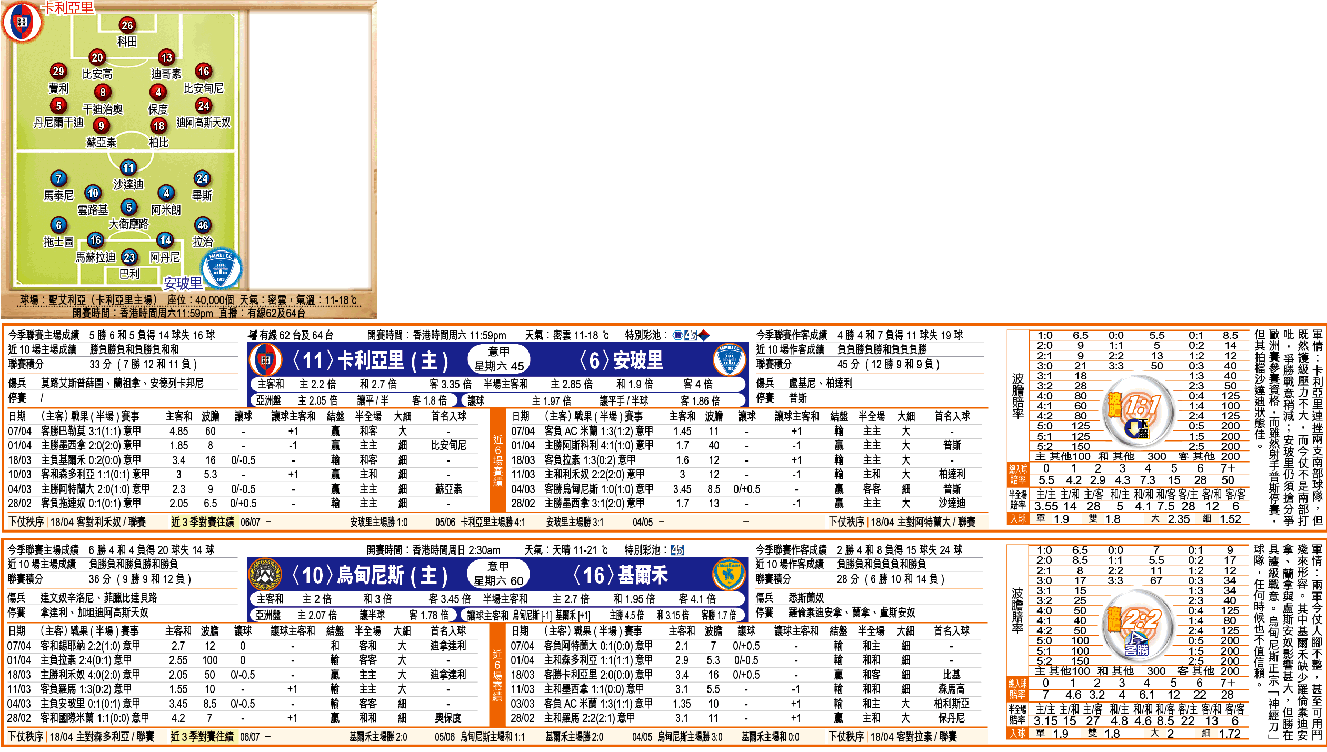 卡利亞里兩連勝,而安玻里上仗作客遭AC米蘭以技術性擊倒,加上今仗有當勇射手之一的普斯停賽,照計主隊值得秤高。不過,藍鑽石始終覺得卡利亞里的薩丁島主場威力不再之餘,最近兩連勝的主因是面對兩支南部球隊,打吡戰自是加多兩錢肉緊,今仗的爭勝意慾應稍減。