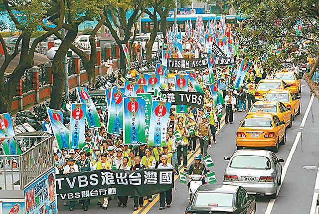 台灣綠營支持者昨在台北遊行,高舉標語與旗幟,要求TVBS撤出台灣。 呂仁欽攝