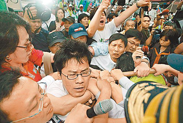 遊行人士企圖用火把點燃寫有TVBS字樣的道具牌,警方立刻行動,搶走火把。雙方互相推撞,扭作一團。 呂仁欽攝