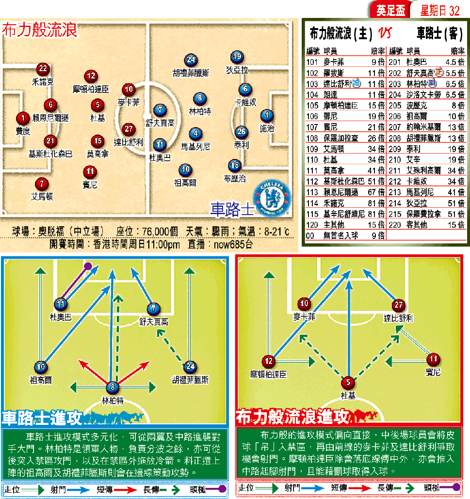 已奪得今屆聯賽盃的車路士,當然希望可以盡攬歐聯、足總盃及聯賽,成為「4冠王」,因此,在周日的足總盃準決賽時,定傾力殺敗布力般,進軍決賽場地溫布萊。雖然,車路士於周三要踢英超聯補賽(作客韋斯咸),領隊摩連奴今役可能會變陣,派出布歷治、狄亞拉及胡禮菲臘斯等副選,但車路士副選之實力不比正選差;加上「一條脊骨」施治、泰利、林柏特及杜奧巴料都會悉數上陣,故戰力仍在布力般之上,贏波冇問題。