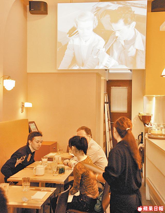 餐廳以流動影像代替牆紙,營造懷舊氣氛。Frank指在牆上放電影是「空間小法術」,郭詩詠也大讚設計巧妙:「光影流轉代替燈光效果,隨時轉換,食客可感受到不同氣氛。」Frank準備將放映名單上載至網站,圖中播放的是1953年的《MHulot'sHoliday》。