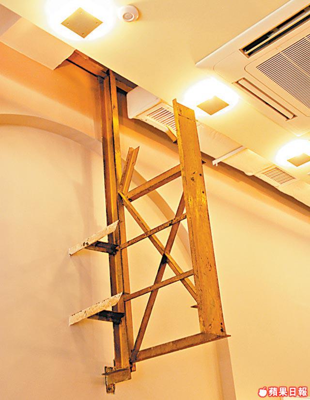 餐廳有一團長方形舊鐵架從牆而出,原來是運米工具。米舖員工把米吊起,從這頭送到另一端,「鐵架原本很大,我怕客人爬架,所以保留部份。」Frank笑說。