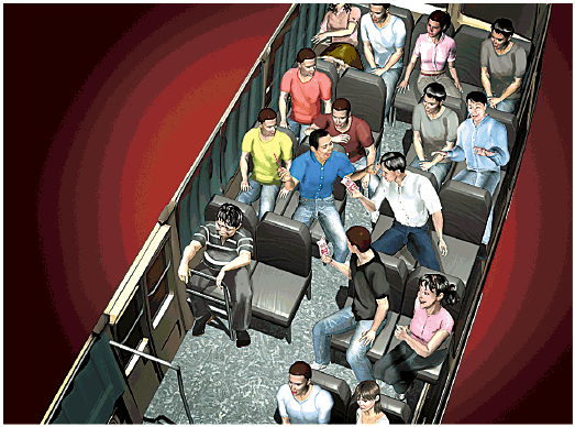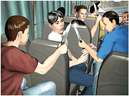 正當乘客玩得興起之際,一干人等露出賊相,「七、八個人突然站起來,拿着刀要我們交出手機和錢,一名老太太身上戴着的耳環和戒指也被搶了」。瞿先生說,當時車匪都身處座位外側,令乘客無法逃走。