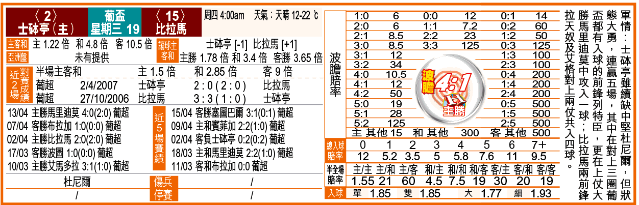 現向雙料冠軍進發的士砵亭,周三在葡盃4強主場對弱隊比拉馬,可望在90分鐘作出了斷;「讓球主客和」士砵亭[-1],取「主勝」,並吼3:1及4:1波膽。