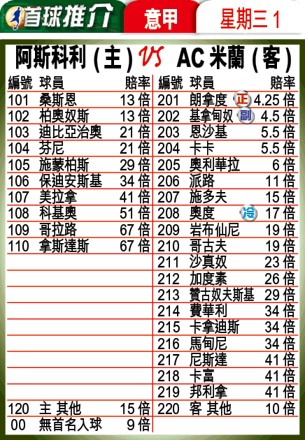 AC米蘭雙箭頭朗拿度及基拿甸奴近態不俗,沒必要犯險扒冷,故兩人分頭一般都要捧場;如認為AC近仗皆有後場球員助攻得手,則可取有後上射門腳頭的奧度。