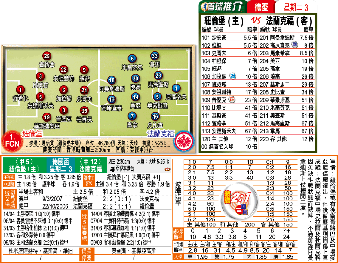 周二爭入今屆德國盃決賽的紐倫堡及法蘭克福,同是陣容不整,但前者有主場之利,加上後者要兼顧德甲聯護級戰,故可秤高主隊紐倫堡,取1.8倍的主W。(球賽編號:星期二3;亞視本港台明日2:30am直播)